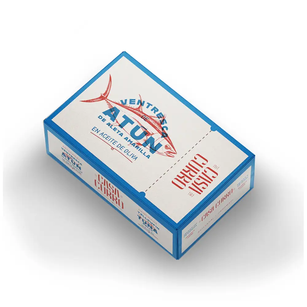 La Ventresca de Atún Casa Curro es, sin duda, la joya de la corona de las conservas de pescado. Procedente de la zona abdominal del atún, esta pieza es la más valorada debido a su exquisita proporción de grasas insaturadas, lo que le otorga una jugosidad y una suavidad que no se encuentran en ninguna otra parte del pescado. Cada filete se extrae con mimo y se limpia de forma manual para garantizar que llegue al consumidor en láminas finas y enteras, bañadas en un aceite de oliva premium que potencia su sabor natural.